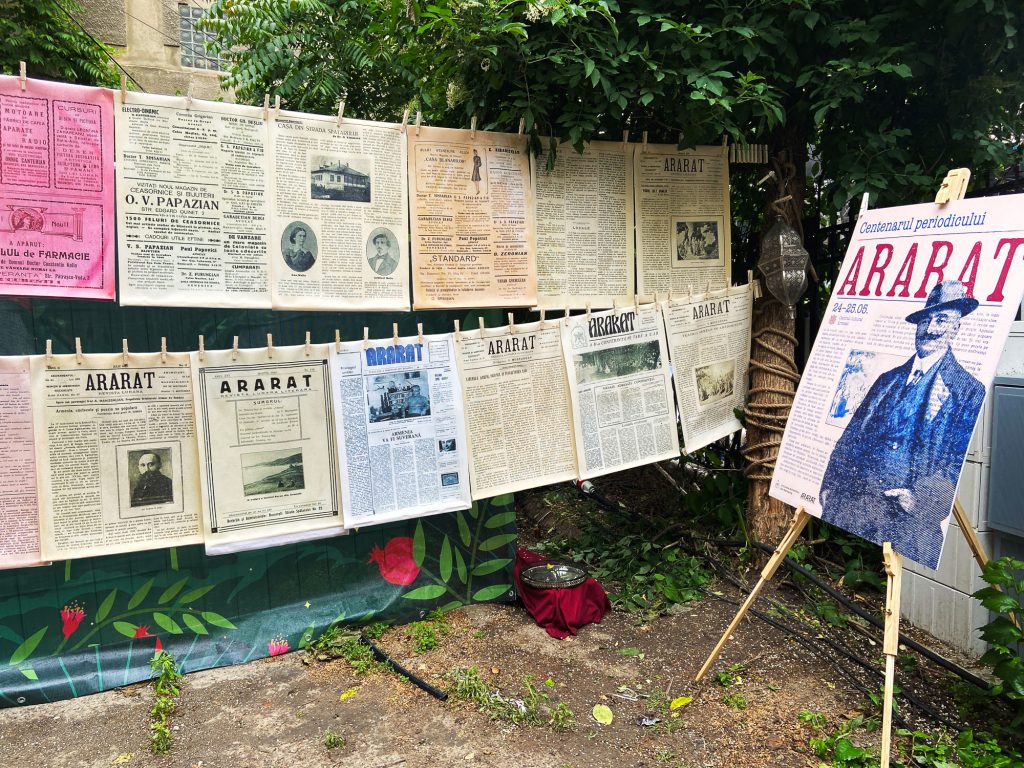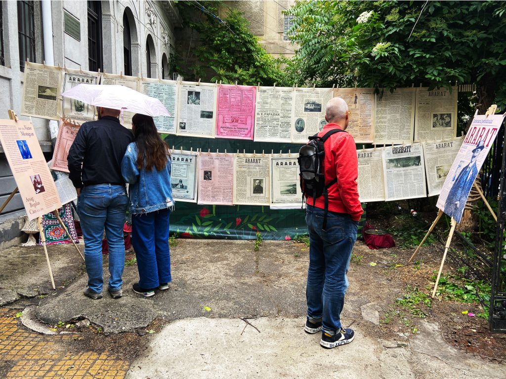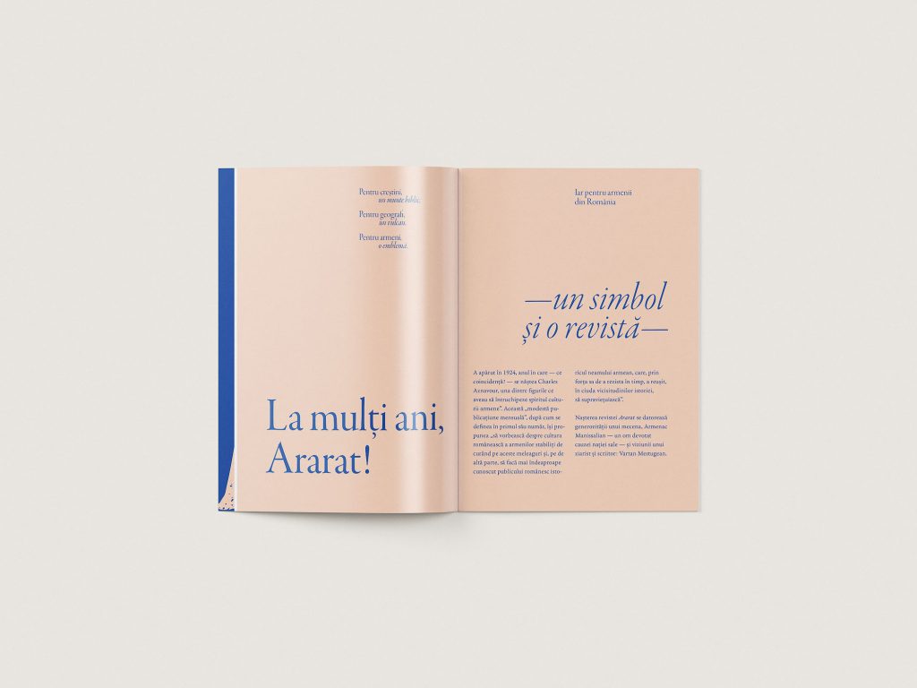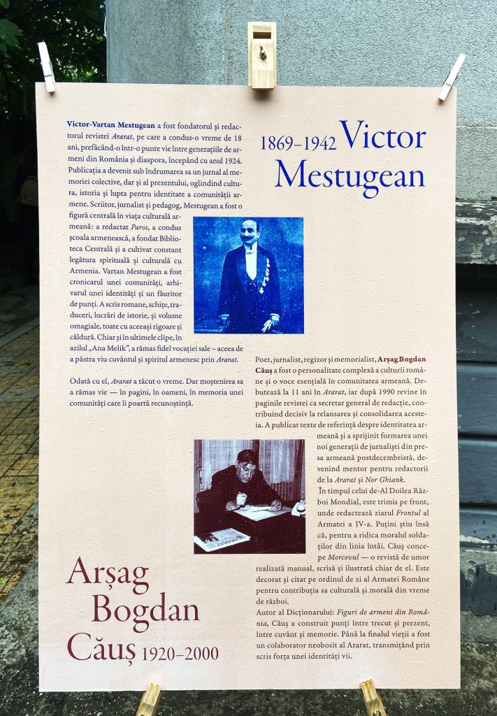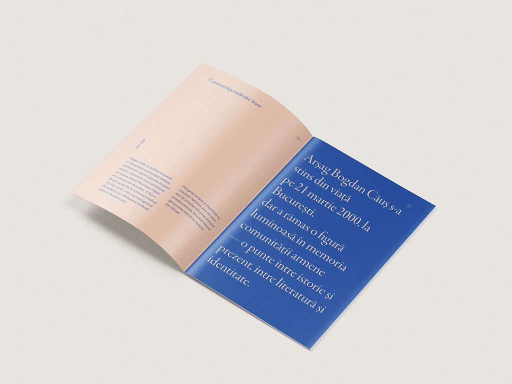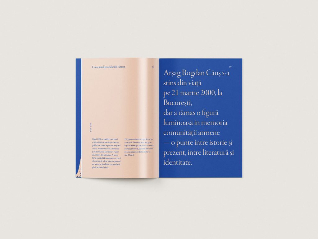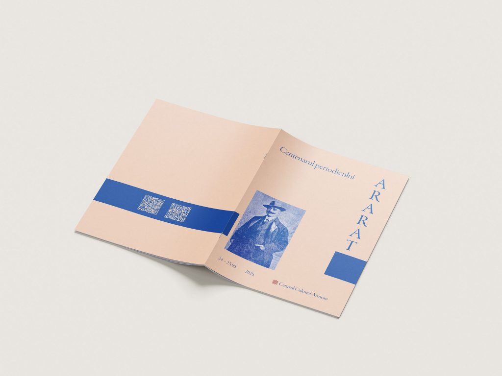 For the centenary of Ararat exhibition, I designed the commemorative brochure and an outdoor art installation: 15 pages from the magazine printed on canvas and hung “to dry” in the Armenian Center’s yard, evoking memory as something living and aired. The project also included a large-format poster and a panel about the magazine’s founder, blending editorial design with spatial storytelling.